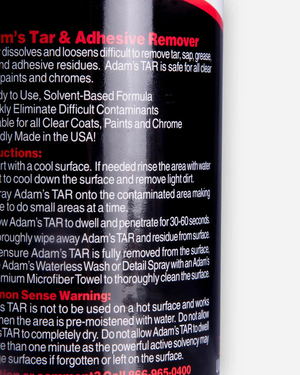 يذوب Adam's TAR (مزيل القطران والمواد اللاصقة) بسرعة ويفكك الملوثات التي يصعب إزالتها مثل القطران والنسغ والشحوم والأسفلت والصمغ وبقايا المواد اللاصقة. مادة آدمز آمنة لجميع الطلاءات والدهانات والكروم.