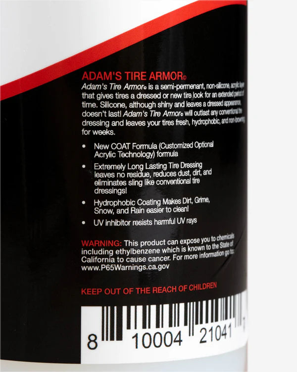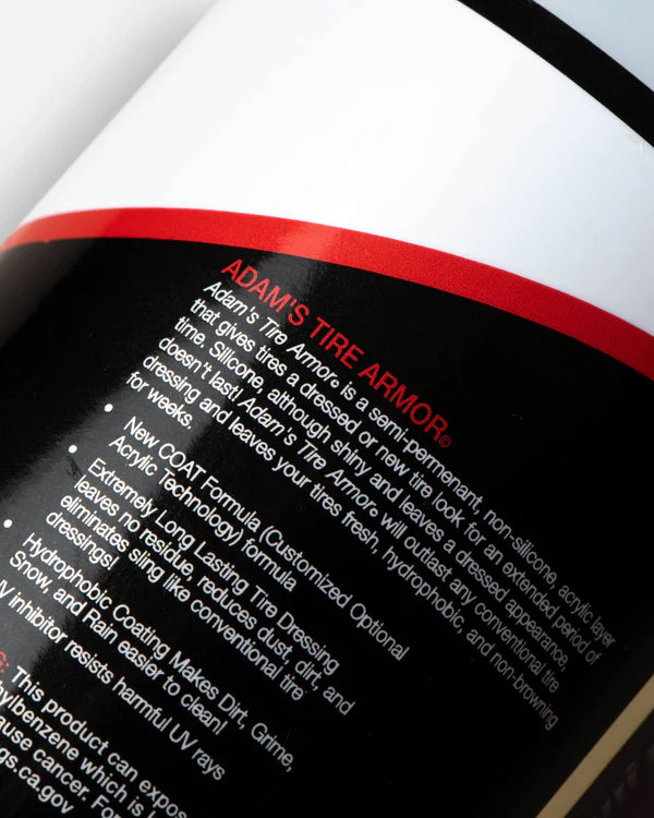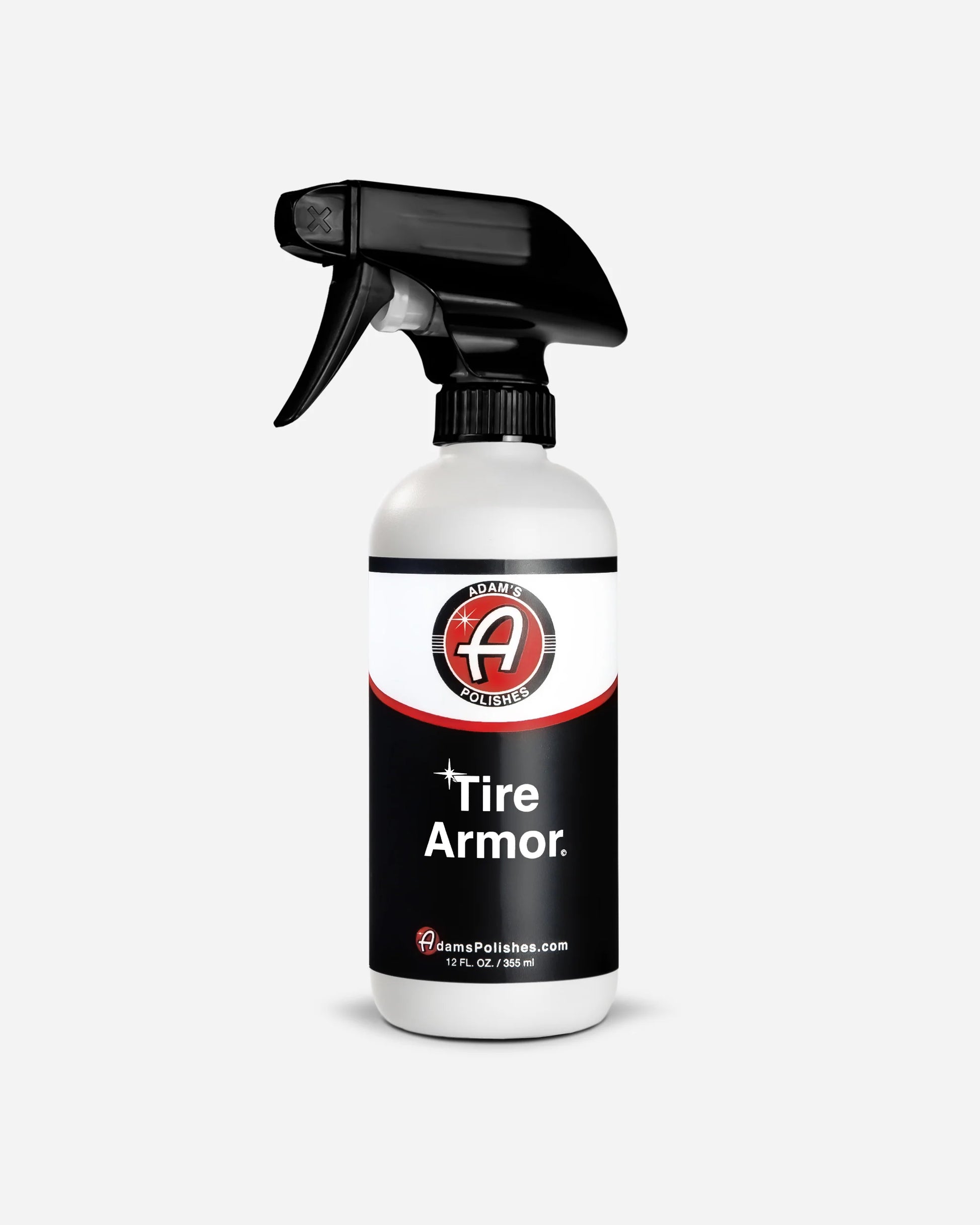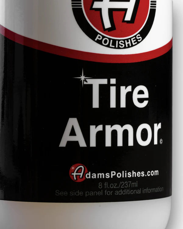 - One of the main attributes we relate to a freshly detailed vehicle is tire dressing. Whether Satin and a rich black color, or the more glossy, wet look, it’s the finishing touch once your entire wash process is over. Your paint stays clean, beads water like crazy, and your windows stay fresh, but your tires are the first to fall off the wagon on a clean vehicle! Most tire shines are packed with silicone that provide a pleasant appearance at first, but wear away with just a few trips under even the most perfect conditions. Adam’s Tire Armor, a semi-permanent, acrylic layer that is here to stay, literally. Hit speed bumps, go off-road, run through the mud… Dressed tires are ready to rally now, thank to Tire Armor.